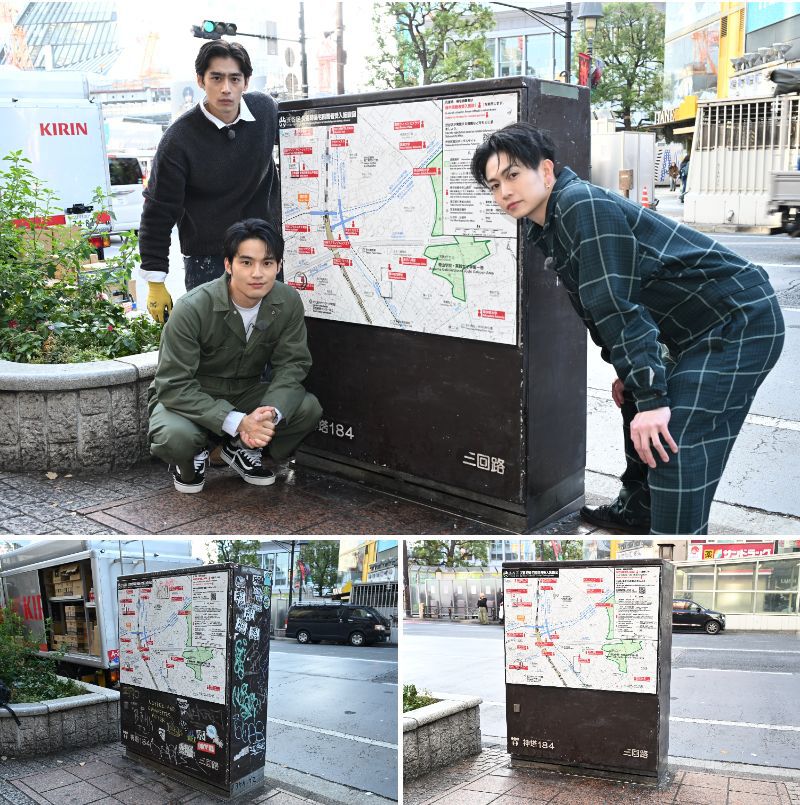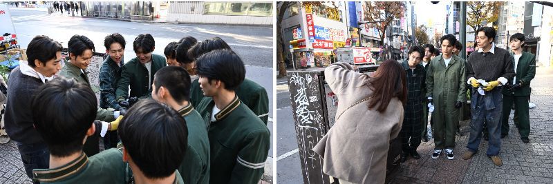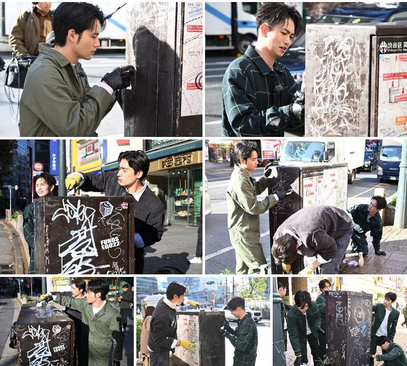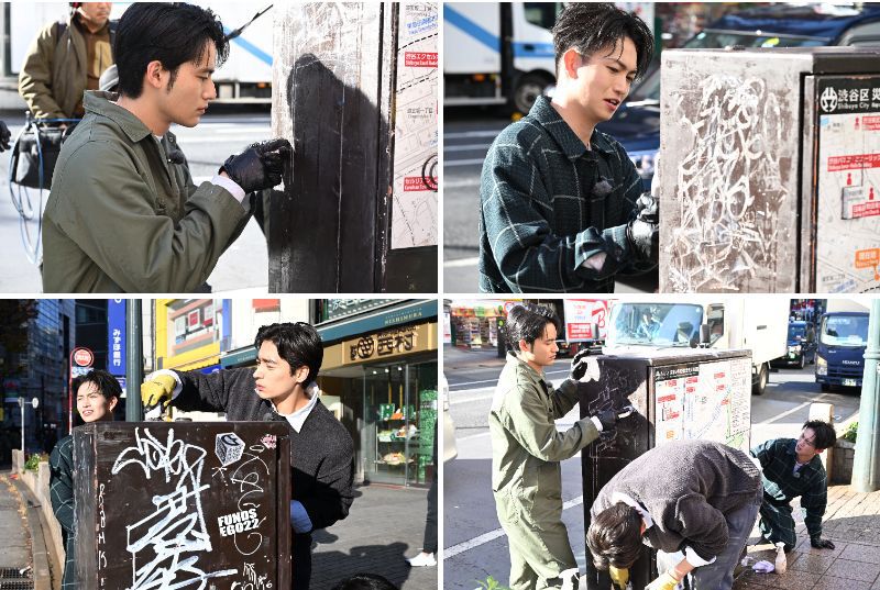 まだ静けさの残る早朝の渋谷に、ツナギ姿の水上、綱、濱尾が集結。「渋谷の街をキレイにします!」と気合十分に、渋谷区環境整備課職員のレクチャーを受けたのち、緑の学ランに身を包んだ<防風鈴>の生徒たちとともに落書き清掃を開始。